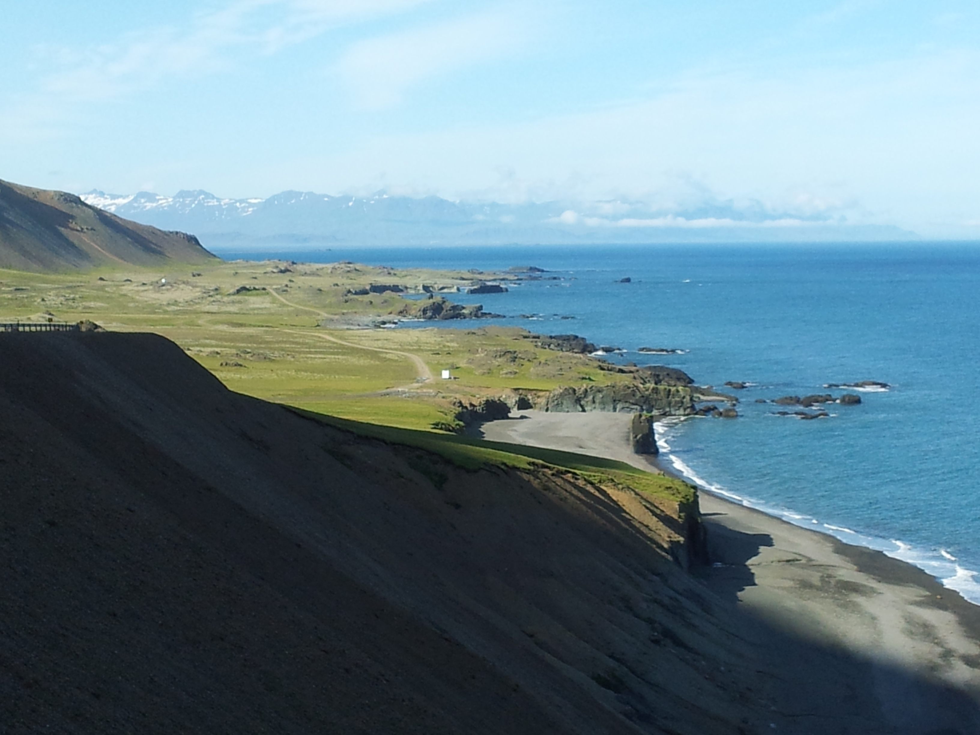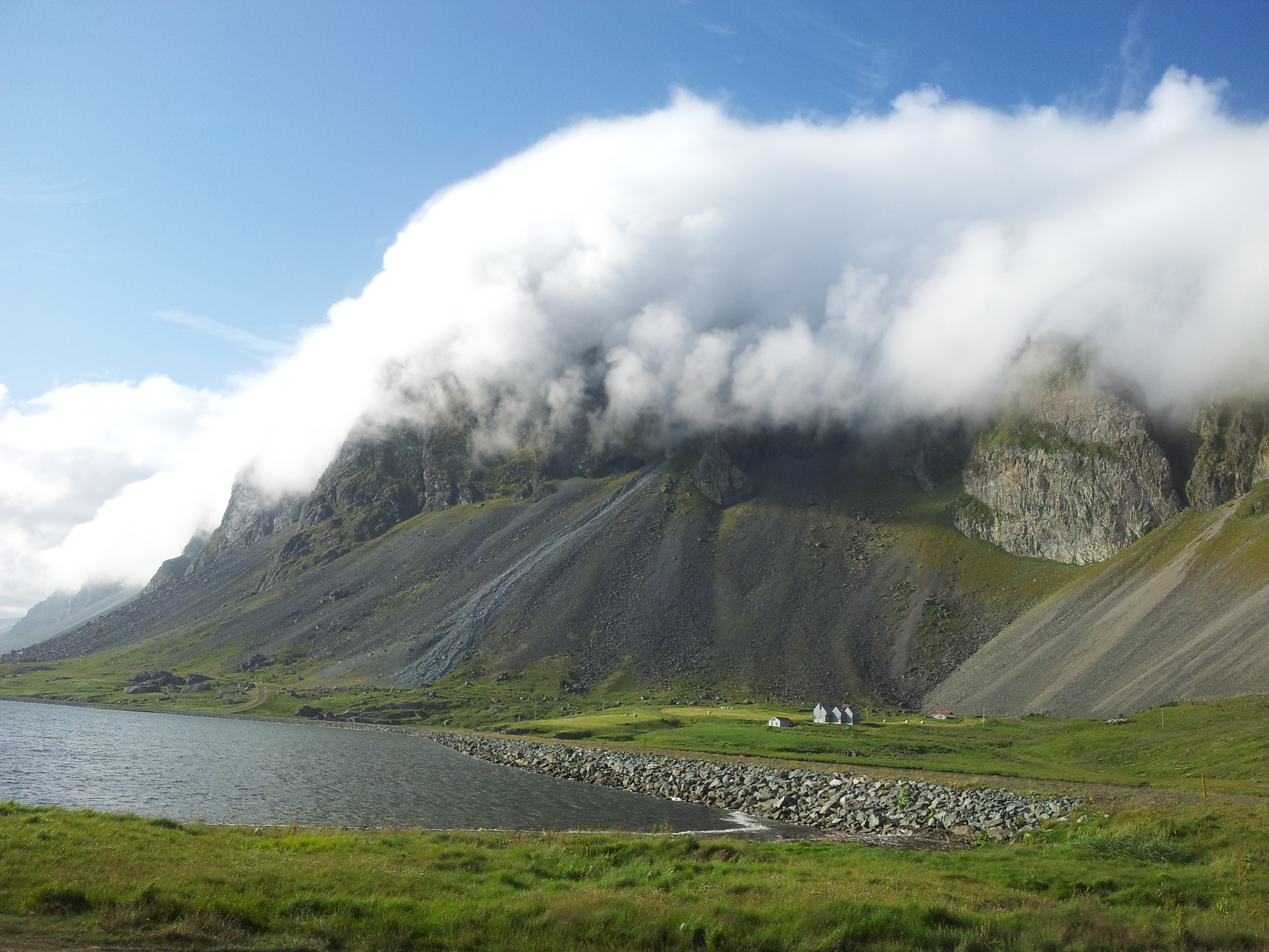 Nach dem Baden fuhren wir über die 92 nach Reydarfjordur um dort dann auf der 96 der Küste an den Ostfjorden südlich zu folgen. Immer dicht am Meer entlang führt die 96 um die Fjorde herum. Nahezu mit jeder Kurve oder mit jeder Kuppe verändert sich das Bild. Links schaut man auf das Meer mit seinen schwarzen Stränden und den immer abwechslungsreichen Schärenfelsen. Rechts liegen mal näher mal etwas entfernter die Steilhänge die teils noch mit kleinen Schneefeldern versehen und an ihrer Spitze mit Wolken verziert sind. Davor, oft greifbar nah am Hang, liegen immer mal wieder kleine Bauernhöfe und deren Wiesen auf denen man das gute Wetter nutzt und das Heu wendet oder zu großen Ballen rollt.