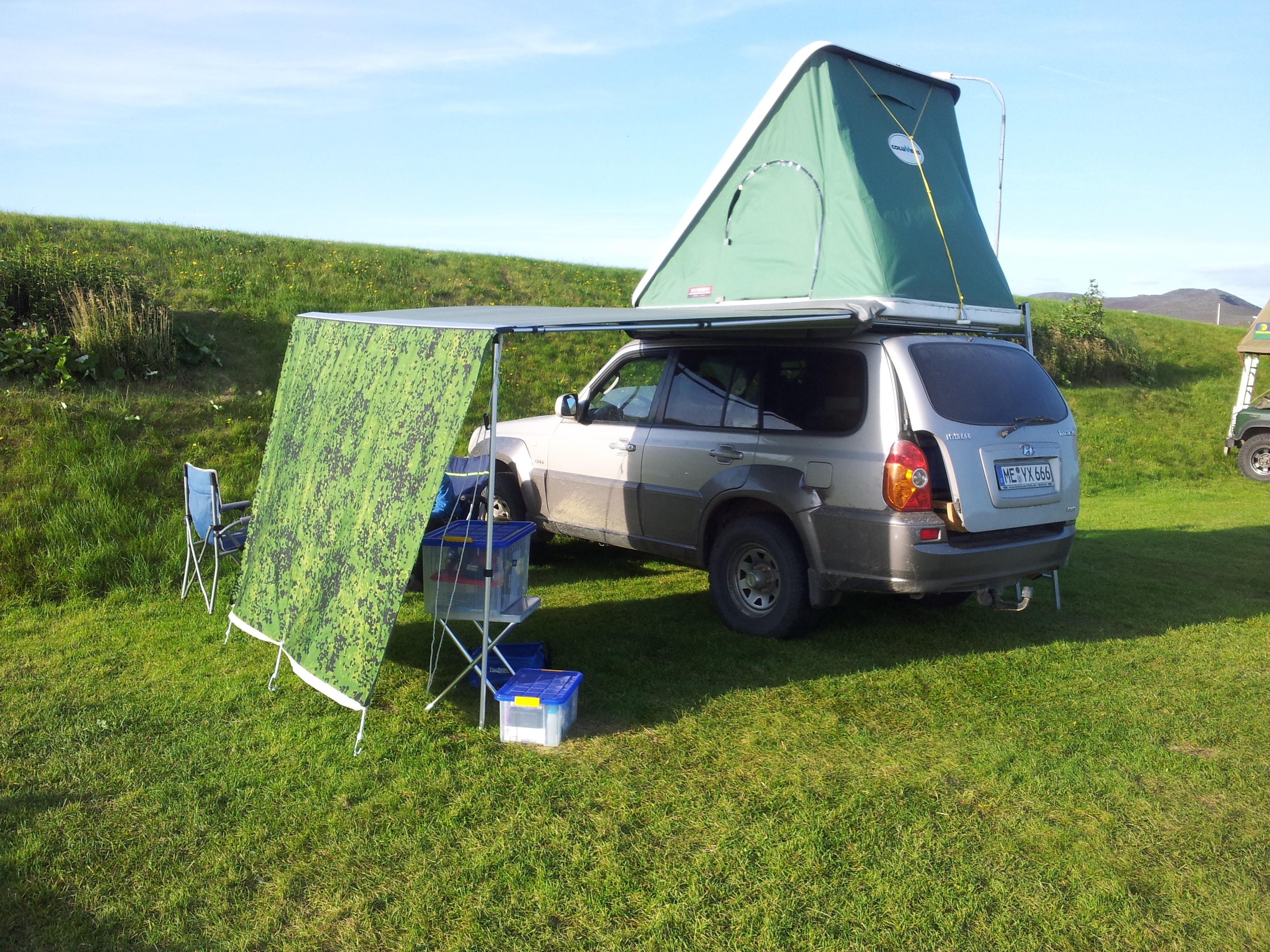 In der Nacht hatte es heftig gestürmt. So gegen 4 Uhr habe ich dann das Auto umgesetzt um wenigstens noch ein paar Stunden Schlaf zu bekommen. Janik hatte seinen Spaß bei der Umsetzerei. Er blieb im Dachzelt liegen während ich langsam über die Wiese in den Windschatten fuhr.