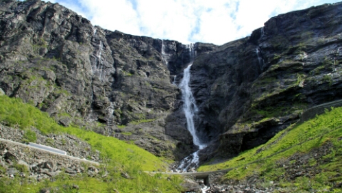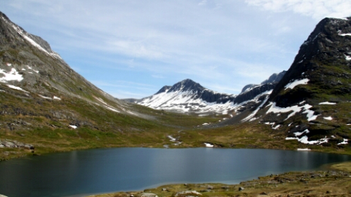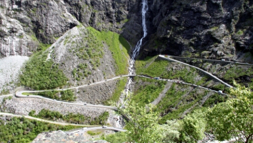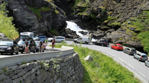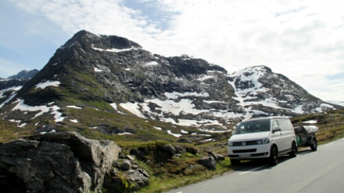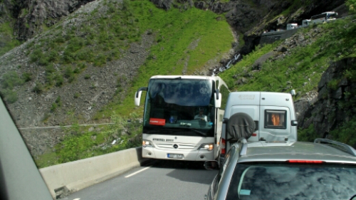 Vorbei an Geiranger ging es den Berg wieder hoch über den Trollstigvegen in Richtung Norden. Der Weg führte rauf und runter an Fjorde und Hochebenen vorbei. mit mehreren Fähren haben wir die ein oder andere Wasserstraße genutzt um schließlich zum Höhepunkt des Tages zu kommen. Dem Trollstigen. Die wohl berühmteste Serpentinenstraße Europas. Etliche fahren erst gar nicht runter sondern schauen sich das Spektakel von oben nur an (oder sind schlichtweg zu feige). Nahezu die gesamte Strecke ist von oben einsehbar und man kann frühzeitig die sich begegnenden Busse, Wohnmobile und Autos sehen. Spannend wird es, wenn ganze Fahrzeugkolonnen mehrere Meter zurücksetzen müssen weil ein Bus sich in einer der vielen Spitzkehren oder Engstellen fest gefahren hat. Wir sind natürlich mit unserem Gespann mitten ins Getümmel rein gefahren. Was wir aber nicht wussten, war die Tatsache, dass in der Umgebung ein Radrennen als Teil eines Triatlon statt fand. Und natürlich führte die Strecke über den Trollstigen! Wie bescheuert muss man sein die Strecke so zu planen? Noch bekloppter sind diejenigen, die das mitmachen und da rauffahren (wärend der Verkehr weiter rauf und runter rollt). Aber besonders dösig sind die, die das Spektakel durch Befahren der Strecke noch richtig spannend machen, also quasi wir mit unserem Gespann. War das ein Spaß! Gute 90 Minuten haben wir gebraucht. Einige Male mussten wir zurücksetzen (bergauf natürlich) oder haben uns ganz dicht an den Rand gequetscht. Muss man nicht jeden Tag haben, aber so einmal im Urlaub ist das schon lustig. Und es lag ja auf unserem Weg …