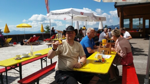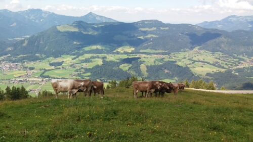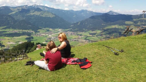 Bei herrlichem Sonnenschein ging es zum Unterberghorn. Das ist der Hausberg in Kössen, der in unmittelbarer Nähe unseres Platzes liegt. Der Weg rauf führte östlich anfangs auf normalen Wegen, später aber auf engen und steilen Pfaden bis zur Bärenhütte rauf. Puh, trotz Trekkingstöcken war der Aufstieg doch ziemlich anstrengend. Nach einer ausgiebigen Pause (und trotz innerlicher Abmachung den Rückweg mit der Gondel zu machen) ging es dann an der westlichen Seite des Bergs wieder runter zu unserem Platz. Auch der Rückweg führte anfangs auf breiten Wanderwegen entlang. Ab ca. der Hälfte ging es aber wieder auf steilen und engen Pfaden runter ins Tal. Alles in allem waren wir gut 8 h unterwegs und haben uns redlich auf das Abendessen gefreut.