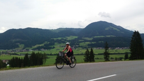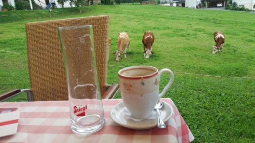 Aber ganz ohne Wegzährung ging es dann doch nicht. Im Cafe Anneliese in Schwendt gabs dann noch ein Radler, ein Haferl und ein Stück Kuchen. Das Ganze wurde duch stetiges Gebimmel der grasenden Kühe begleitet.