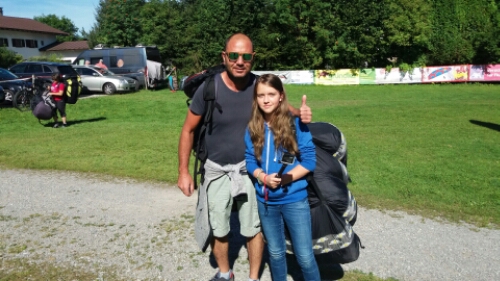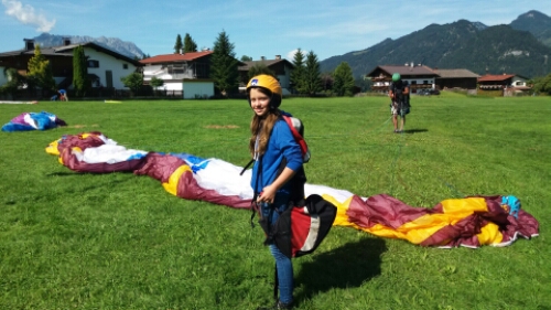 Heute Morgen fuhren ich und Papa mit den Fahrrädern zur Fliegerbar, an der Flugschule Kössen. Dort warteten wir auf meinen Gleitschirmpiloten Andi !!! Als Andi da war nahm ich einen Rucksack, der ungefähr genauso groß war wie ich, worin sich der Gleitschirm befand und Andi nahm die Sitze. Und dann ging es auch schon ab zur Gondel. Wir stiegen ein und ich war schon super aufgeregt. Auf dem Weg nach Oben unterhielten wir uns. Die Aufregung ging ein bisschen weg und ich entspannte mich ein wenig. Als wir ausstiegen gingen wir noch kurz ein Stückchen den Berg hoch und dann auf eine kleine Wiese. Dort breitete Andi den Schirm aus und gab mir meinen Sitz (der Sitz war ein Rucksack mit Sitzschale). Es standen noch ungefähr 7 Leute vor uns aber wir durften uns vordrängeln, da die Anderen freizeitmäßig da waren. Ich wurde von Andi an den Schirm geschnallt und er schnallte sich selber an. Dann sollte ich loslaufen, doch der Schirm war zu stark und ich kam nicht von der Stelle. Andi half mir duch kräftiges Laufen und schon flogen wir in der Luft. Er zeigte mir die Alpen, das Tiroler Herz und Südtirol. Tirol war früher mal ein See. Durch ein Erdbeben rieben sich die Erdplatten aneinander und stellten sich zu den Bergen auf. Das Wasser ist dann über die Berge abgeflossen und das Tiroler Herz (aus der Luft sieht die Landschaft wie ein Herz aus) ist entstanden. Zurück zum Flug: Ich fragte Andi ob wir auch Loopings fliegen können. Doch er sagte, dass ich zu leicht bin aber dass wir eine Schleife fliegen können. Wir flogen dann auch Schleifen und ich fühlte mich kurz schwerelos. Bei der Landung musste ich ein Stückchen laufen und dann ging der Schirm zu Boden. Papa, Mama und Janik haben die ganze Landung gefilmt. Ich habe den ganzen Flug mit Papas GoPro aufgenommen und daraus macht Papa noch ein Video. Es war mega super geil und ich werde das auf jeden Fall noch einmal machen!