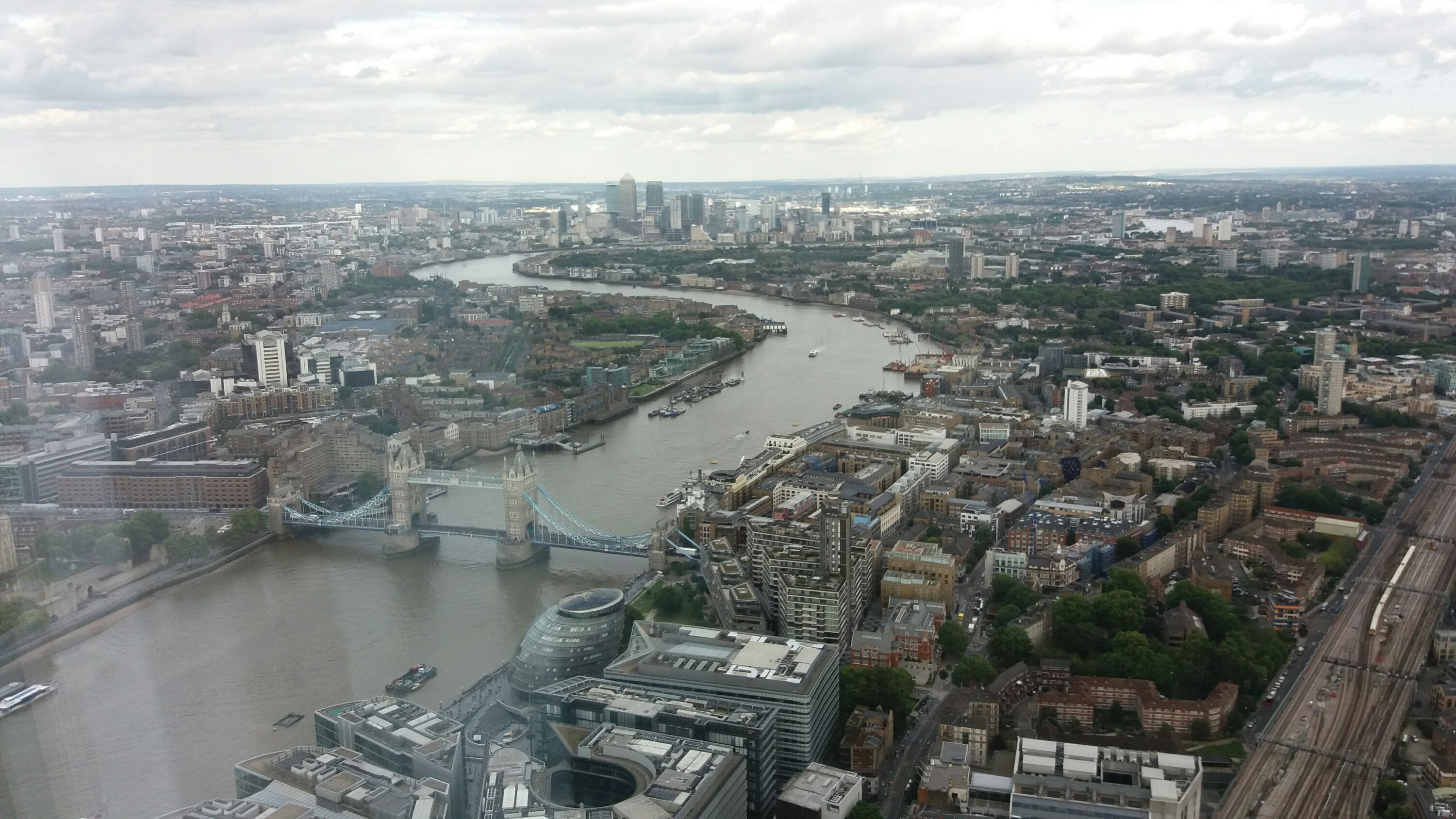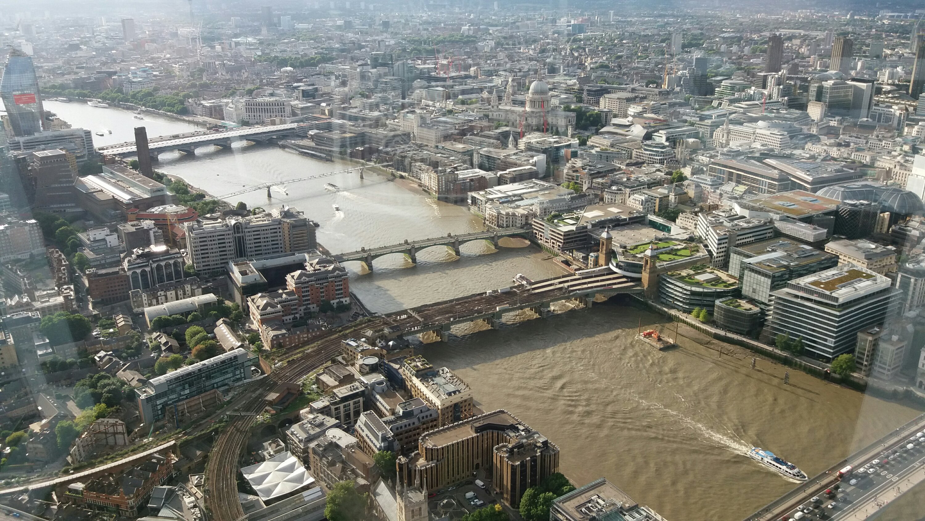 An der Westminsterbridge bleiben wir eine Zeit lang am Ufer der Themse sitzen und bestaunen das Treiben auf dem Fluss. Weiter gehts mit der Tube zum höchsten Gebäude der Stadt, The Shard. Wir haben uns für heute Karten besorgt um auf den Aussichtsplattformen in gut 240 m Höhe London zu bestaunen. Mit super schnellen Aufzügen gehts rauf auf die zwei Plattformen. Von hier oben hat man einen unglaublichen Blick auf die Stadt und den Verlauf der Themse.