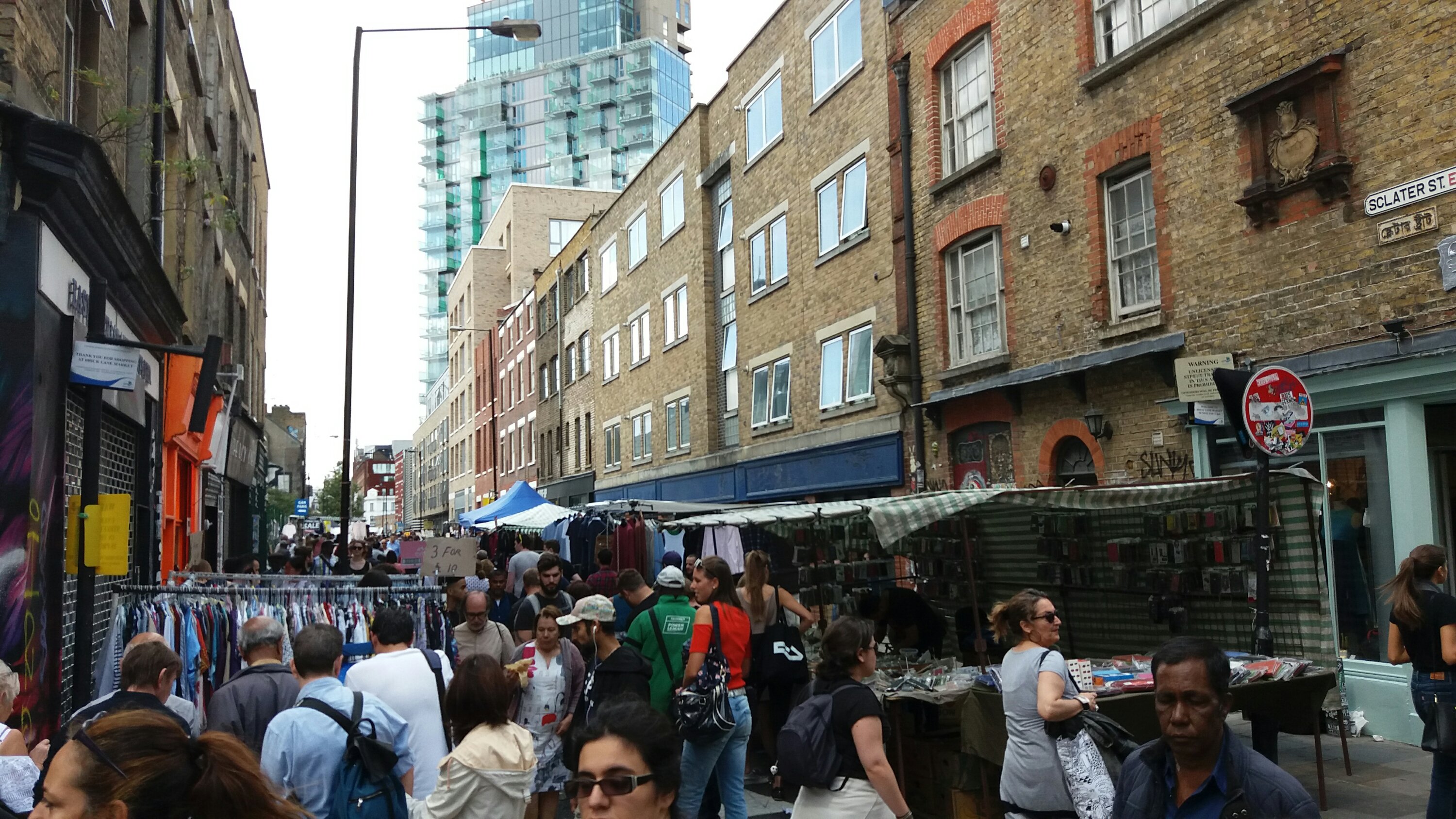 Wieder einmal begleitet uns bei unserem Besuch in London strahlender Sonnenschein. Von Abbey Wood fahren wir in gut 30 min nach London in die Innenstadt. Wir besuchen den Bricklane- und Spitalfieldsmarket. Viel wirklich sehr kreative Kleidung und Vintage-Klamotten werden dort angeboten. Auf den Straßen wird alle paar Meter Livemusik geboten. Sogar ein Schlagzeugsolo von zwei Personen gespielt, im Laderaum eines Ford Transit gibt es zu bestaunen. Ein sehr coole und ungezwungene Stimmung, die uns durch die Straßen begleitet.