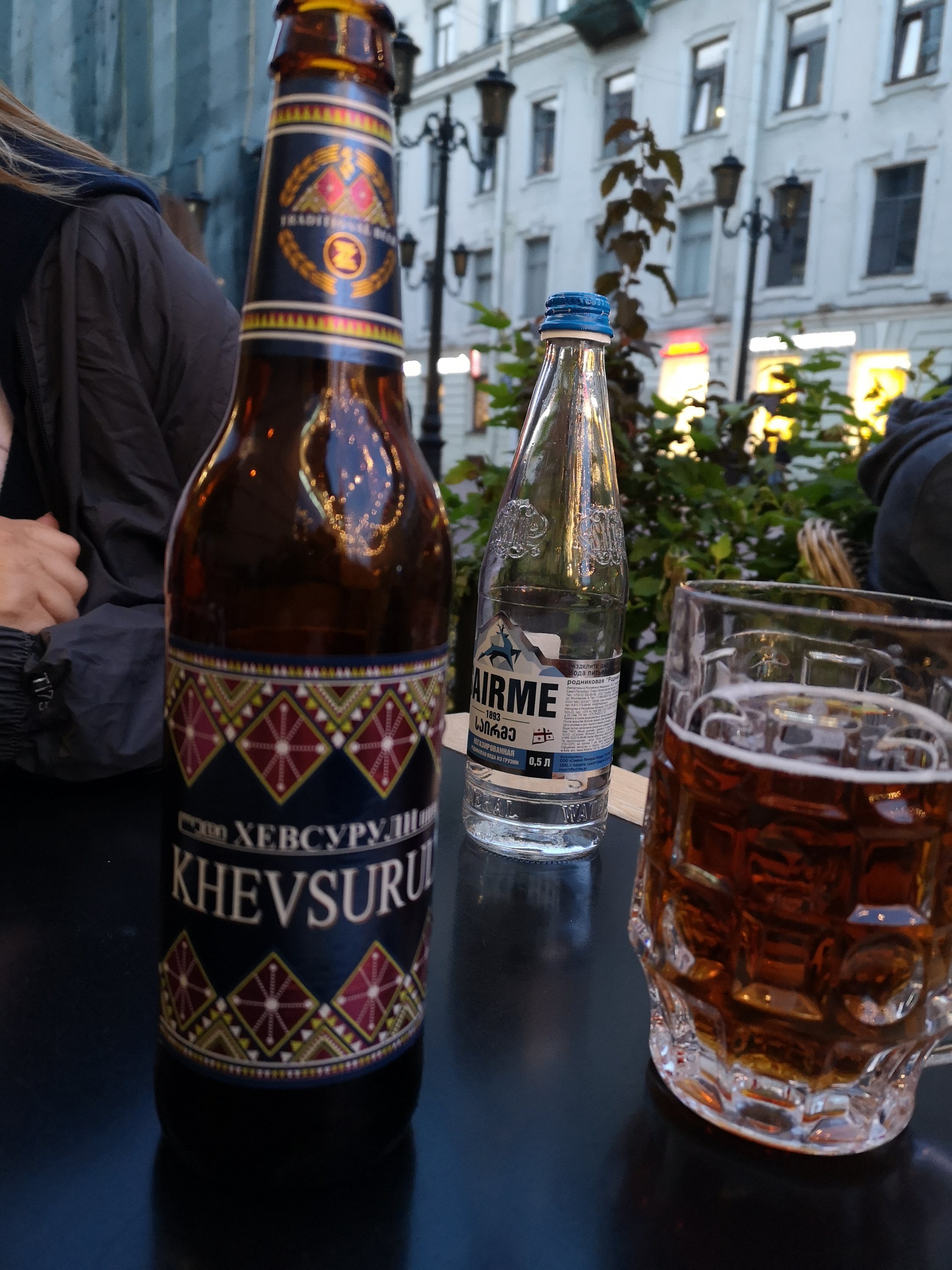 Wärend ich hier schreibe warten wir in einem Georgischen Restaurant auf unser wohlverdientes Abendessen. Wir sind früh aufgestanden und gleich los um unser erstes Breakfast irgendwo in der Nähe zu finden. Anschließend sind wir quer durch die Stadt gelaufen zu unserem Treffpunkt mit dem Guide. Peter haben wir über TripAdvisor gefunden. Wie auch unser Guide in Vilnius, eine wirklich gute Wahl über diese Quelle zu suchen. Wir sind nicht zu den typischen Tourizielen gegangen sondern an einige kleine aber sehr interessante Orte. Wir sind Tram und U-Bahn gefahren, was im Prinzip einfach ist aber mangels Sprachkenntnisse einer kleinen Erklärung bedarf. Nach gut 4 Stunden sind wir dann auf eigene Faust los. Wow! Es gibt so viele interessante Gebäude und Monumente hier, die sich einem aber nicht gleich mangels Sprachkenntnisse erschließen. Mit dem Ausflugsschiff sind wir gut 1 Stunde über die Kanäle quer durch die Stadt. Auch hier sieht man viele interessante Dinge, die allerdings auch nur auf Russisch erklärt wurden. Ein Höhepunkt heute war dann noch der Winterpalast, die Eremitage. Wenn man alle Räume durchlaufen wollte käme man auf gut 24 km! Wir haben uns mit 2 Stunden zufrieden gegeben. Die Palasträume an sich sind schon sehr beeindruckend. Aber es gibt auch unglaublich viele Kunstschätze aus aller Welt zu bestaunen. So das Essen ist da. Mit Georgischen Bier. Prost!