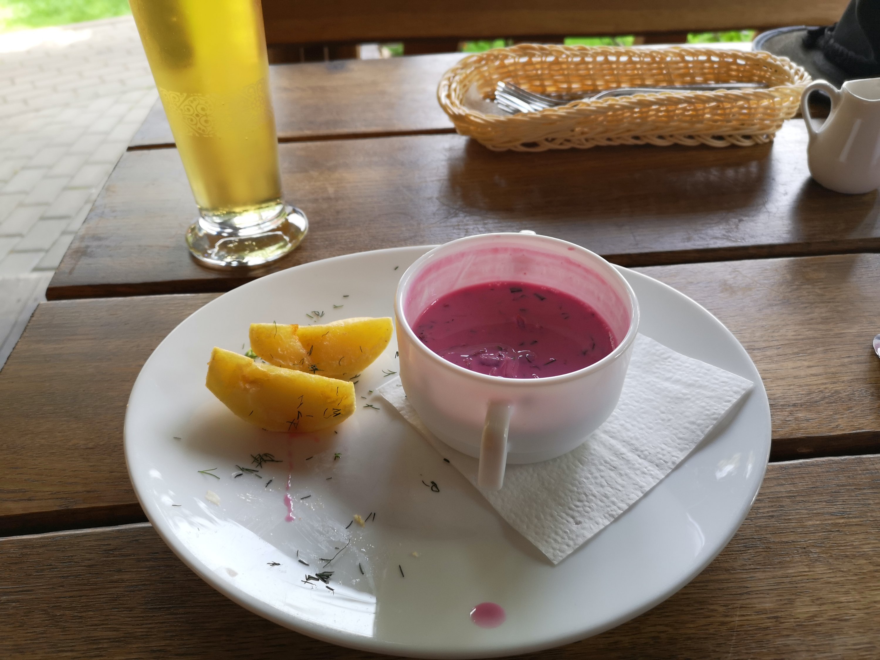 In Preila selber gibt es ein wunderschön gelegenes Restaurant mit tollen Blick auf das Haff und leckerem Essen. Die kalte Rotebeete Suppe ist übrigens eine litauische Spezialität die mit heißen Kartoffeln serviert wird.