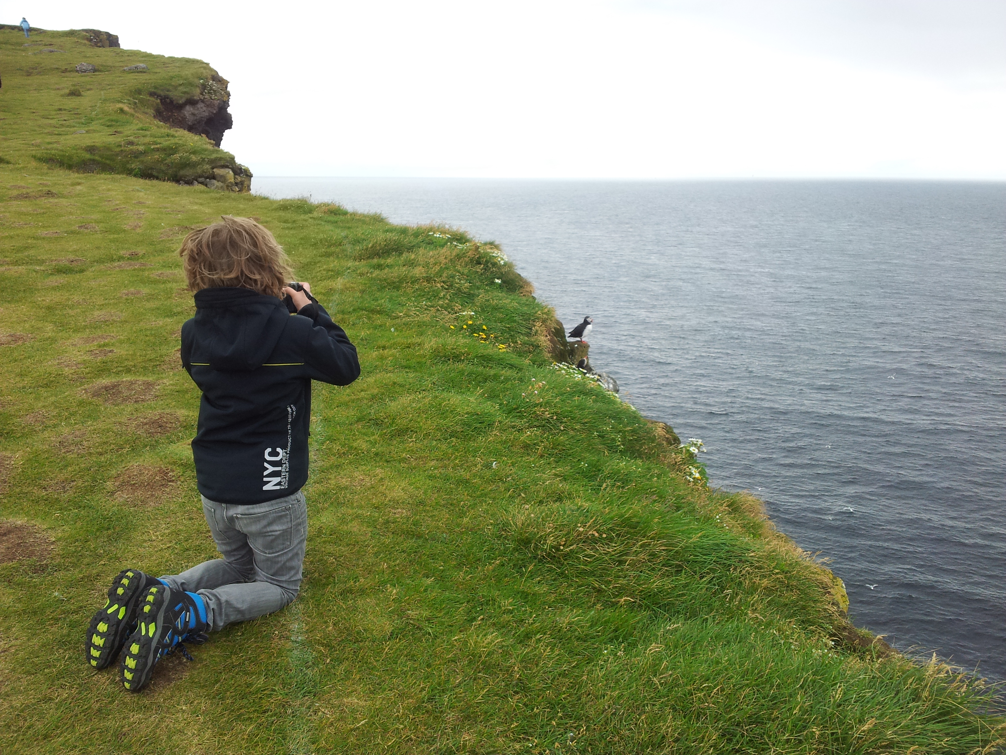 Nach unserem Frühstück sind wir in die äußerste Spitze des unteren Teils der Westküste, an den Vogelfelsen Bjargtangar, gefahren. Das Wetter meinte es gut mit uns und bei leichtem Wind und Sonne liefen wir voller Erwartung die letzten Meter zur Steilküste. Und dann sahen wir sie schon. Die Papageientaucher. Auf oft nur wenigen Quadratzentimetern saßen sie in der Steilwand oder flogen umher. Ein toller Anblick und eine prima Gelegenheit zum Fotografieren.