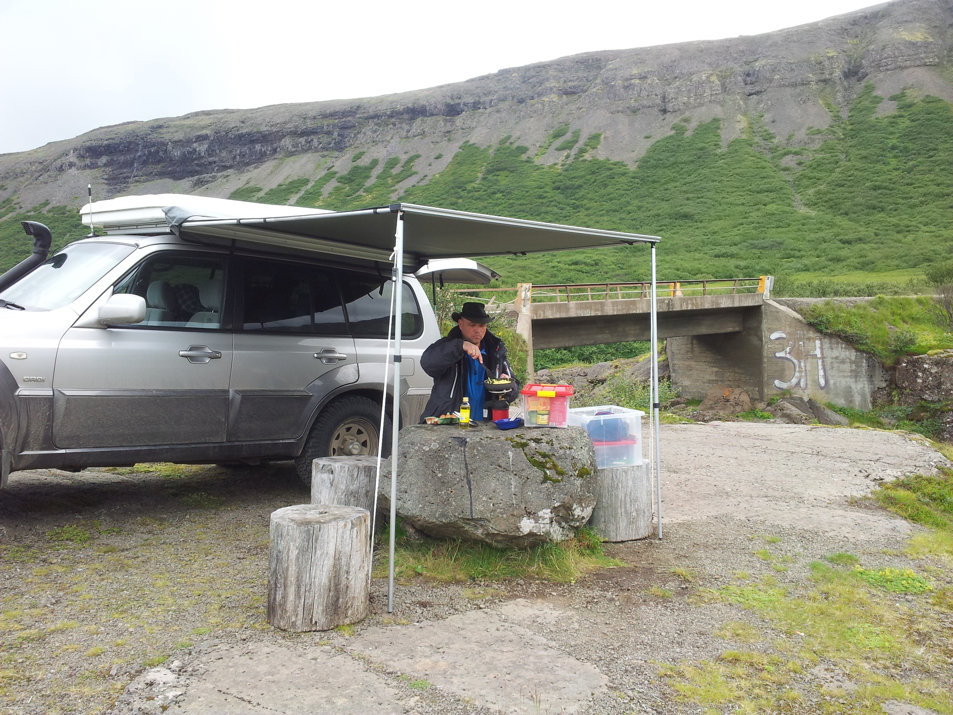 Nach etlichen Fotos haben wir uns dann auf den Rückweg zum Abzweig an der 62 gemacht. Weiter ging es in den Norden, der nächsten Landzunge der Westfjorde entgegen. Wir fuhre über die 62 bis Patreksfjördour wo wir einen kleinen Stop einlegten. Anschließend ging es über die 63 und etliche Pässe die teilweise deutlich über 500 Meter hoch gingen in Richtung Bildudalur. Ab hier folgten wir der 62 in östlicher Richtung bis wir wieder auf die 60 gestoßen sind. Zwischendurch gab es kleinere Wasserfälle und abgelegene Höfe. An einer Brücke lud ein Picknickplatz zum Mittagstisch ein. Leider nieselte es nach kurzer Zeit, sodass wir die Markise kurzerhand über den Picknicktisch spannen mussten. Der Tisch bestand recht rustikal aus einem Felsbrocken dem einfach ein paar Holzschemel dazu gestellt wurden.