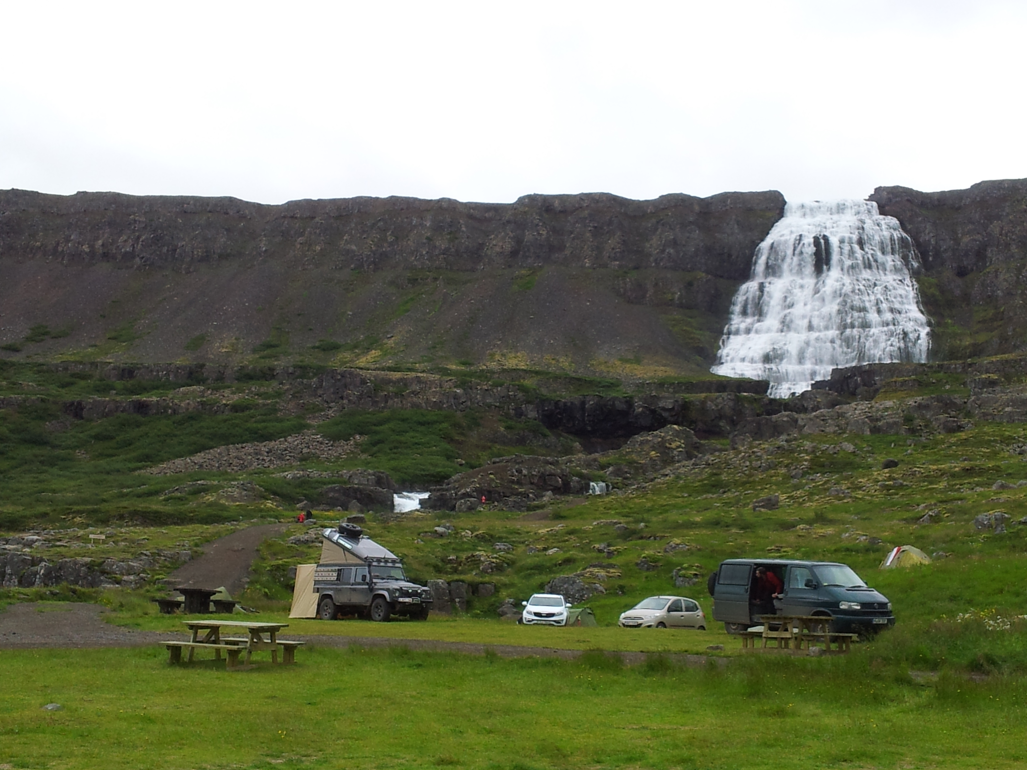 Nach der Stärkung ginges weiter nördlich einem weiterem Highlight entgegen. Der Dynjandi Wasserfall ist schon einige Kilometer vorher vom Pass aus gut zu sehen. Man kann direkt am Parkplatz sein Nachtlager aufschlagen. Da das aber eher was für Menschen ohne Lärmempfinden ist, haben wir es vorgezogen dort nicht zu bleiben.