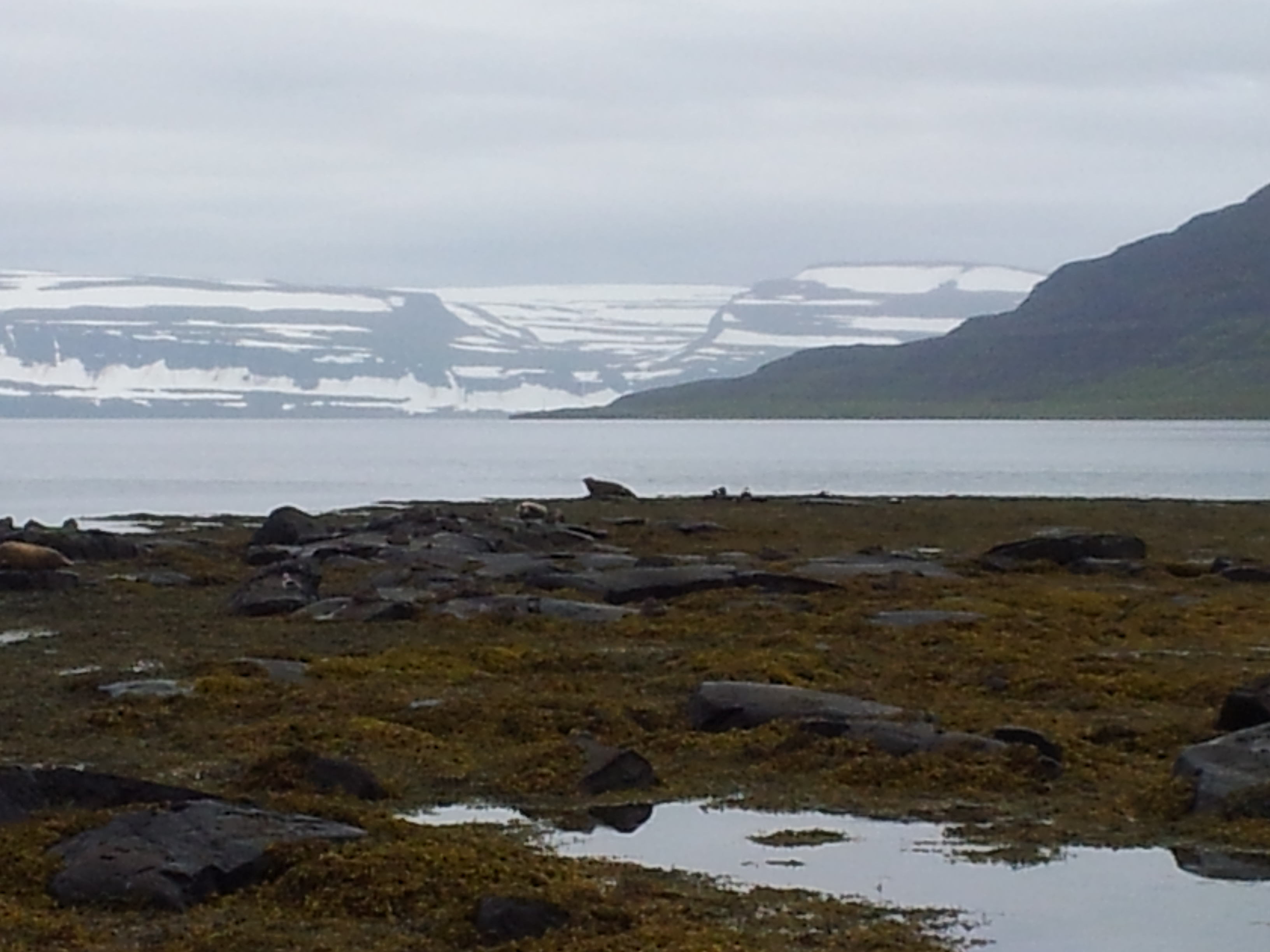 Bei Nieselregen sitzen wir erst gegen 10:00 Uhr unter der Markise beim Frühstück. Irgendwie ist uns die Lust an dem gestern geplanten Schwimmbadbesuch vergangen. So brechen wir auf um die Westfjorde zunächst nördlich über die 60 und anschließend östlich über die 61 zu verlassen. Unser erstes Ziel sollte Isafjördur sein. Dort haben wir unsere Lebensmittel aufgestockt, was für den Erhalt der guten Laune aller Mitreisenden von großer Bedeutung ist. 🙂 Damit stand dann auch schon das Abendessen fest. Lachs mit Nudeln! Den Lachs haben wir, wie schon einmal vor ein paar Tagen, tiefgekühlt gekauft und werden ihn am Abend aufgetaut lecker in der Pfanne zubereiten. Auf der 61 kurz hinter Isafjördur liegen dann gut sichtbar Seehunde faul an der Küste rum. Eine gute Gelegenheit für einen Fotostopp. Zwar bin ich mit meiner Kamera und dem Teleobjektiv Janiks Kamera überlegen, was ihn aber nicht davon abhält munter Fotos zu schießen. Okay, ein bischen neidisch nörgelt er dann doch über den Vorteil des Tele. Als er dann auch mal ran darf ertönt hinter meiner Kamera nur „Boa wie geil ist das denn“!