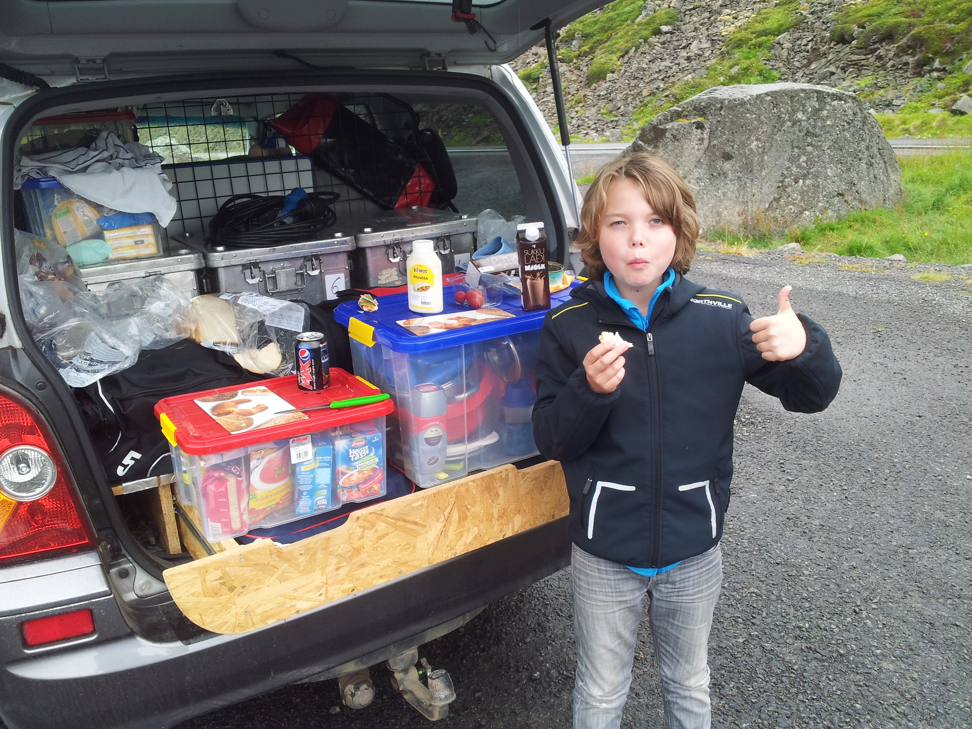 Weiter gehts, immer um die Fjorde herum. An den Hängen sind überall kleine Wasserfälle und Schneefelder auszumachen. An einem kleinen Parkplatz halten wir gegen 15:00 Uhr an und machen uns leckere Tunfischsandwiches. Janik kommentiert unseren Speiseplan für heute nur mit “ Fisch ist gesund“!