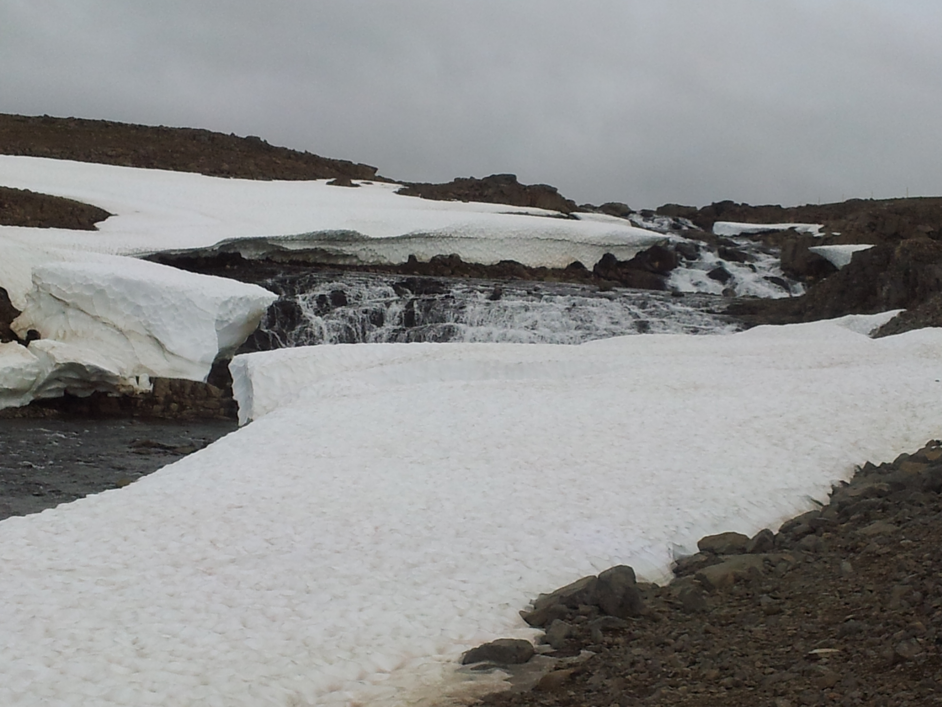 Bei Raudamyn schlägt die 61 eine Haken in südöstlicher Richtung. Erneut geht es einen Pass hinauf. Fast oben angekommen wird ein Wasserfall zwischen einigen Schneefeldern sichtbar. Wir halten erneut für einen Fotostopp und ich versuche mich nochmals mit dem Graufilter an die Art Aufnahmen, die das Wasser fließend darstellen. Das ist mit dem Schnee und dem doch recht böigen Wind keine leichte Aufgabe und ich bin mir auch nicht sicher ob diese Aufnamen etwas taugen werden.